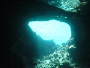 To get into the grotto, you swim under a low ledge and into a bigger inner-cavern. Once inside, there is light from an overhead opening and a few underwater holes and a bunch of fish. Pretty cool. Here are some pics.