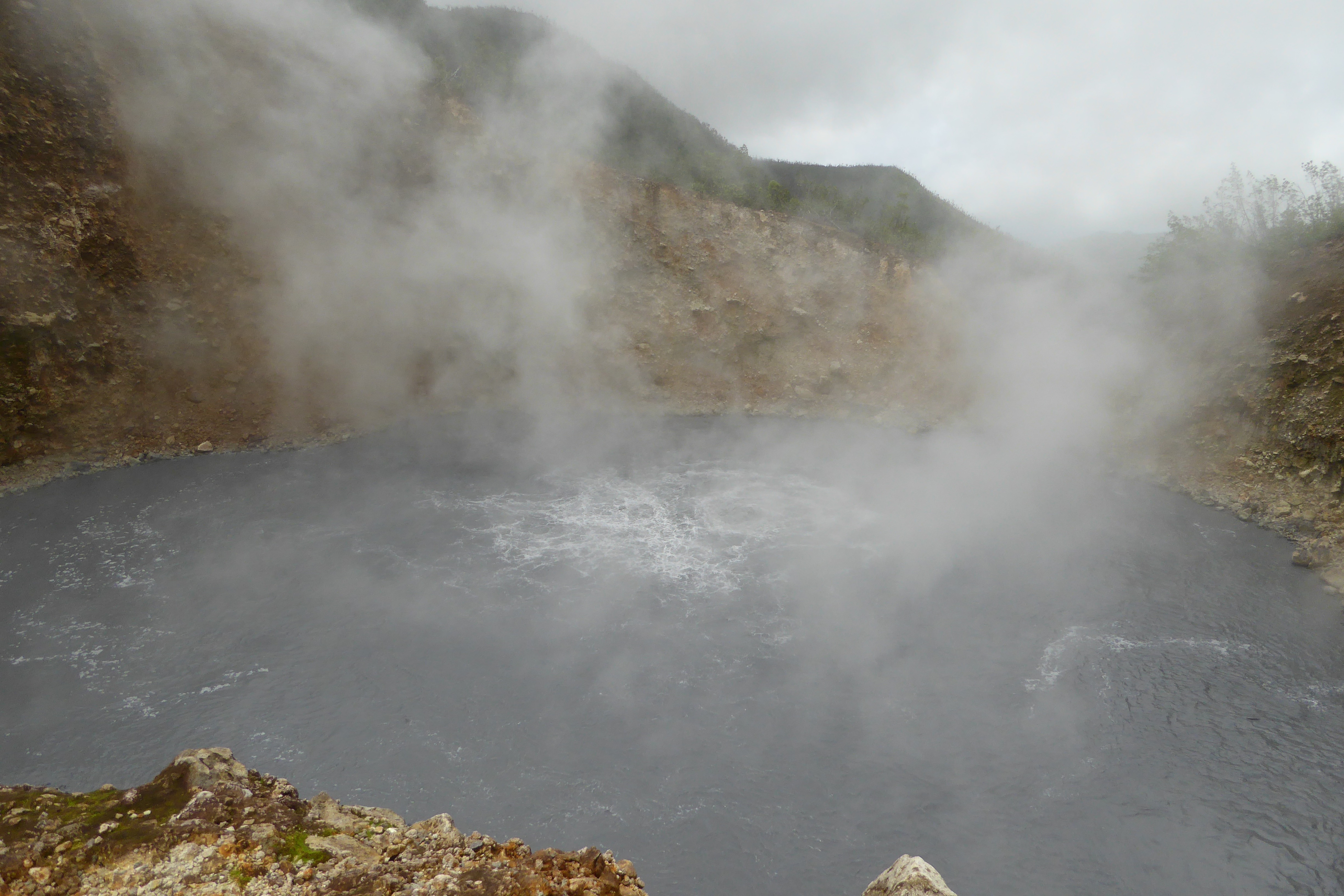 We kept on hiking getting closer and closer to the sulfuric steam coming out of the mountain. It seemed like that we were almost there. I peeked around the corner and was happy to see the end of the path! The boiling lake is going to be right here. We all sat down and waited for the fog stuff to go away. It went away in a few minutes revealing a big lake that was boiling. It looked like a humongous pot that was boiling only in the center. There was a huge bubbling thing in the middle causing the rest of the lake to go up and down! It was super cool!