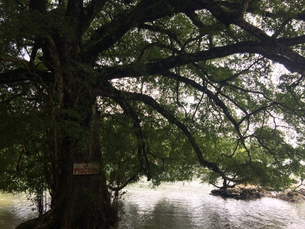 We continued along with lots of laughing, bumping up and down, sometimes a few feet, and mainly having lots of fun. It started to rain minutes later. Heidi saw the sign for the piscina so Heidi, Fenton, and I stayed in one place while Mom told the others who were a bit ahead. We waited for a few minutes and no one came. The rain was getting louder. A whole group of howler monkey started howling then as well.